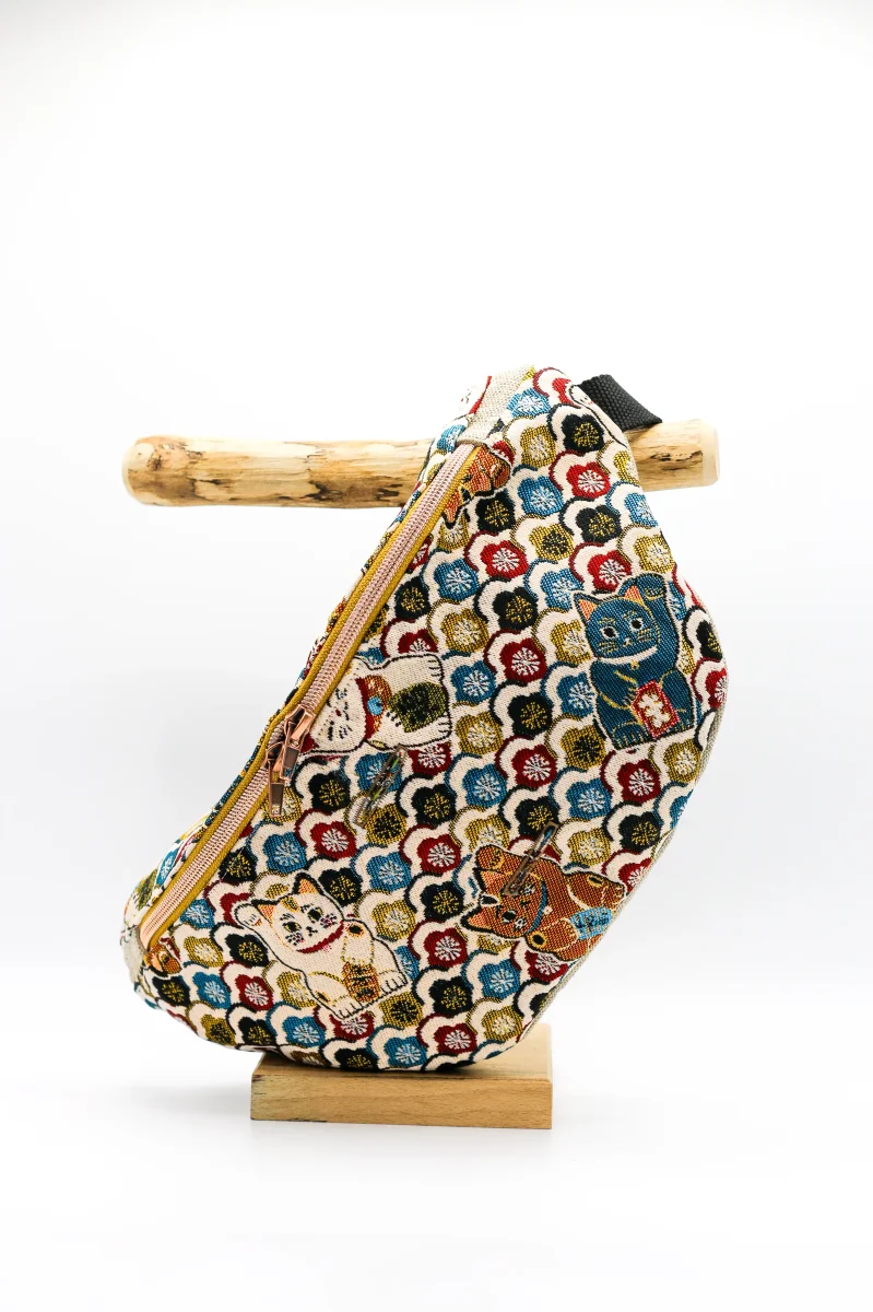 Ce modèle en jacquard revient en grand renfort dans la mode féminine. Ce modèle avec son tissu robuste tissé, multicolore, va ravir toutes les fans de la mode japonisante avec de belles sakura (fleurs de cerisiers) en fond et le fameux chat porte-bonheur décliné en 3 couleurs.