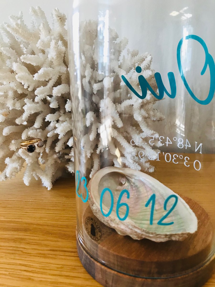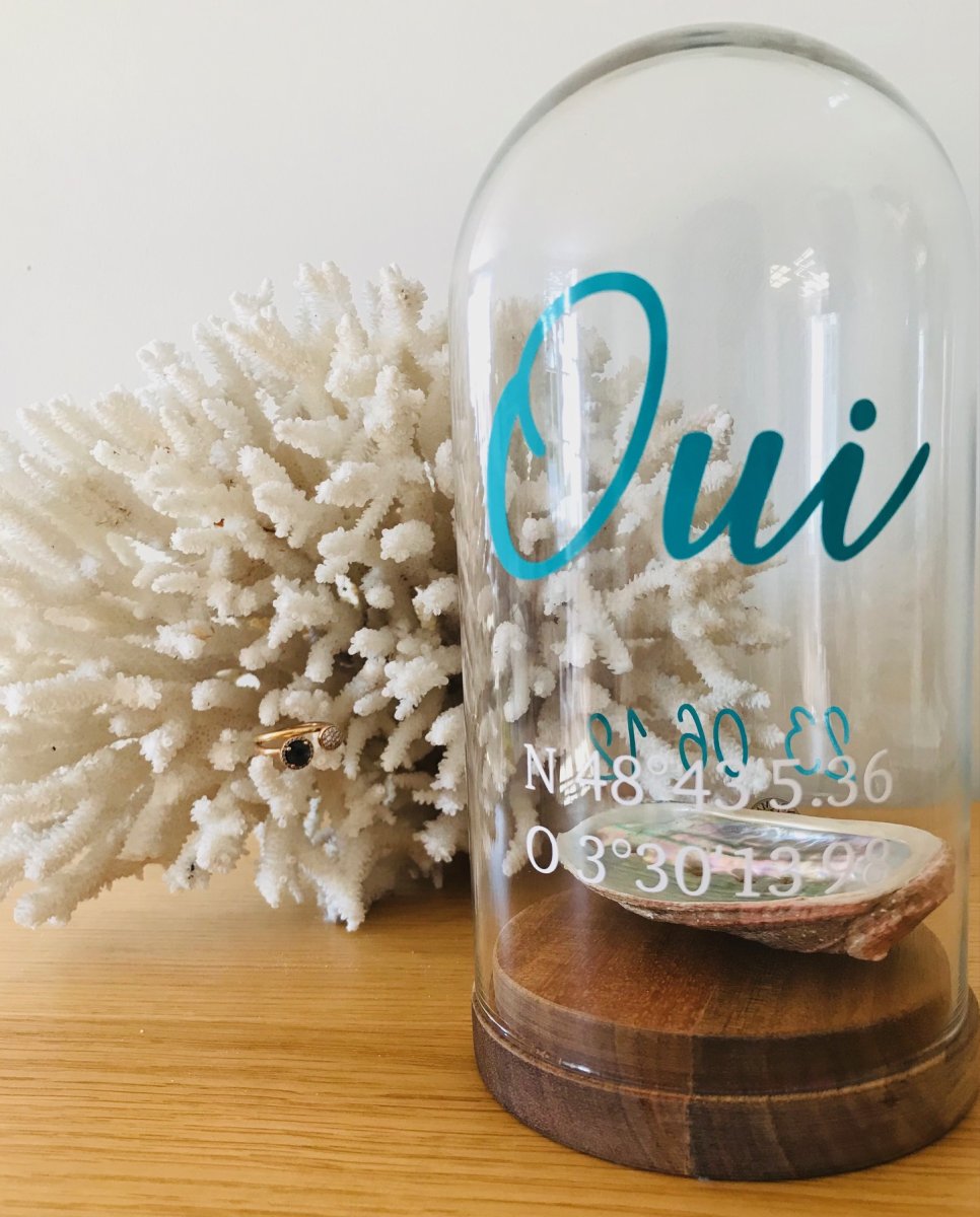 Cloche en verre sur un socle en bois ; à personnaliser avec un mot en grand, une date,… ;