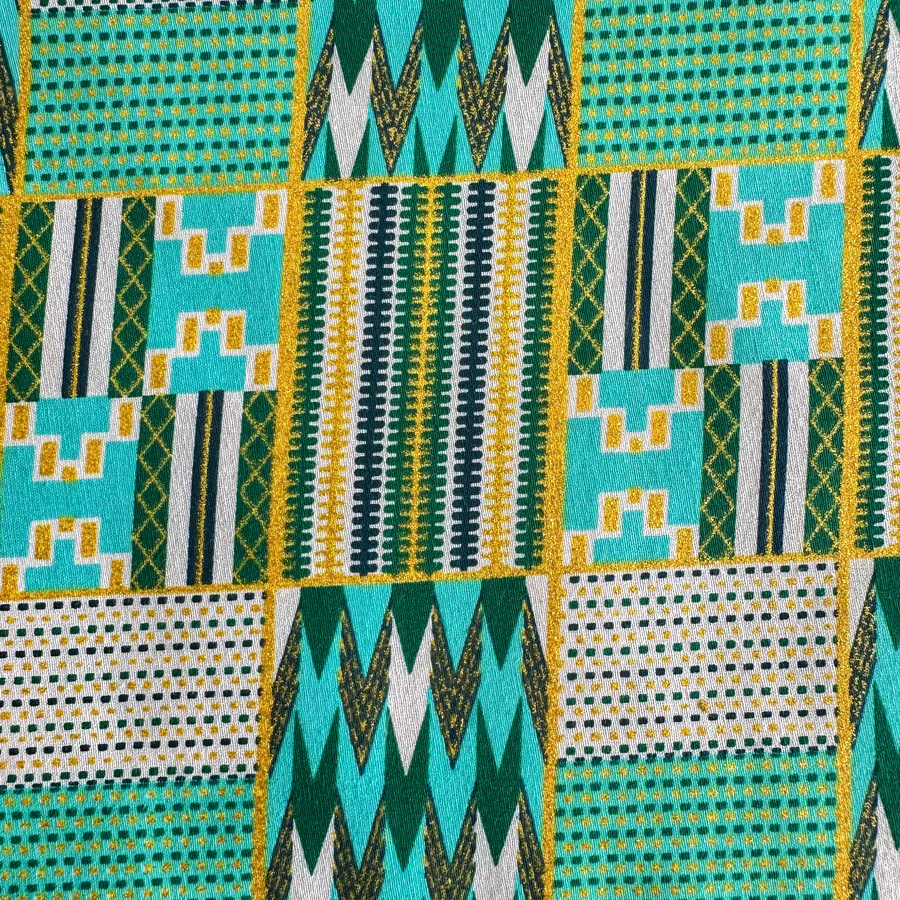 Un style aztèque aux couleurs acidulées sur un tissu aux effets brillants. Une vraie beauté stylée pour l’été !