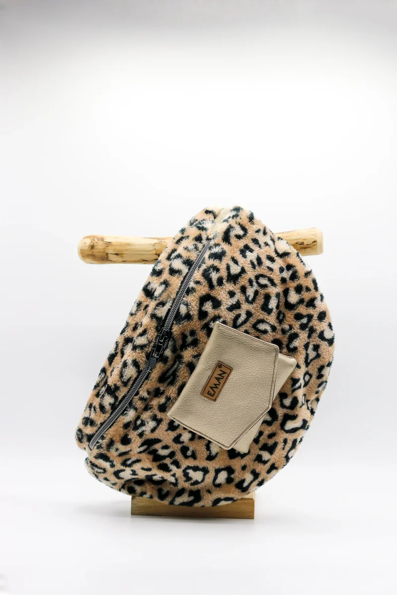 Le sac banane dans sa version urbaine, avec une combinaison toute en délicatesse : le mélange d’une matière vegan toute douce ultra mode avec un effet léopard, réhaussé d’une pochette à friandises amovible, en simili cuir taupe très discret Sable d’or