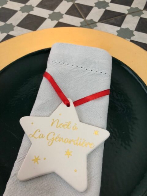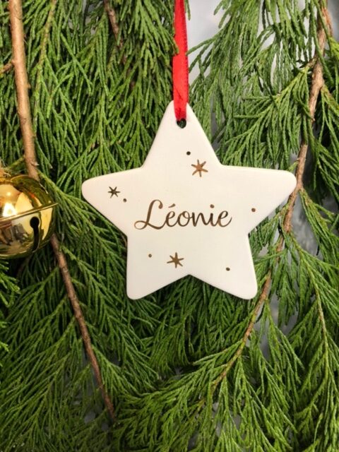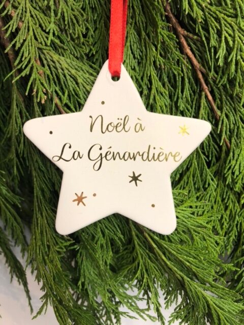 Etoile céramique ; texte doré ; lien satin rouge