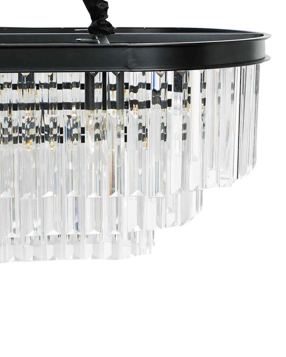 Structure ovale à plusieurs niveaux inspirée de l’Art déco Cristaux taillés pour une réflexion lumineuse étincelante Finition dorée et noire pour un effet chic et contrasté Éclairage LED E14 remplaçable avec variation de couleur (blanc chaud, neutre, froid) Intensité variable compatible avec variateur mural