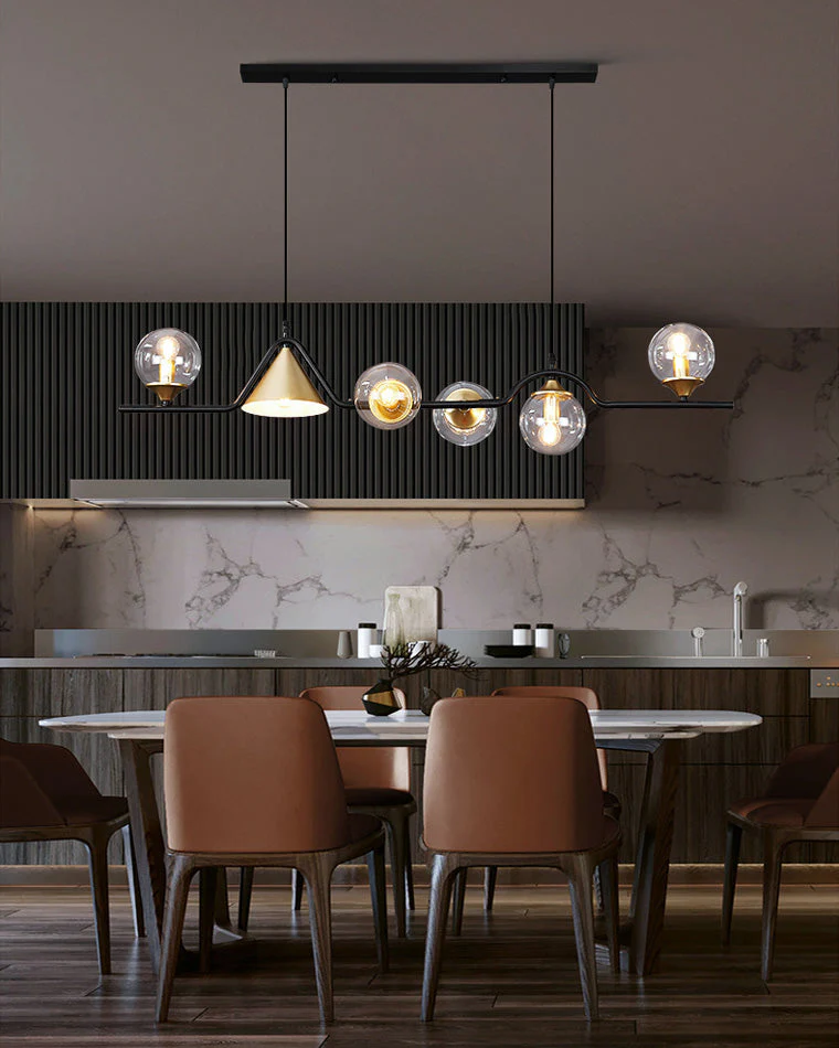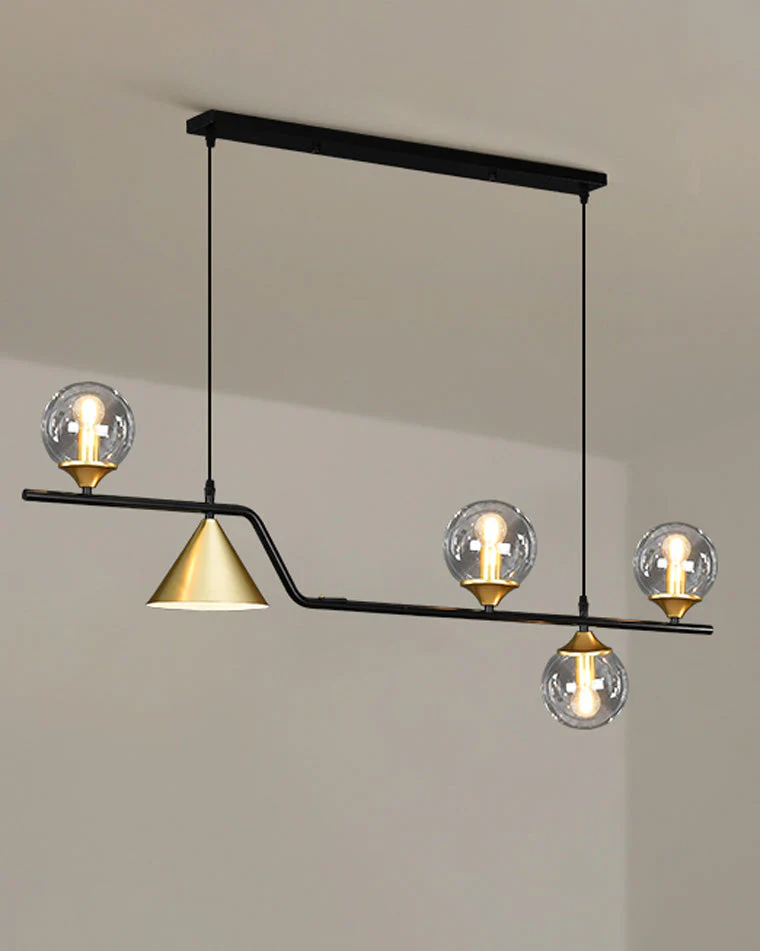 Élevez le style de votre salle à manger avec le Lustre Linéaire en Globe de Verre. Ce luminaire combine un abat-jour conique en métal doré et des globes de verre en blanc laiteux, ambre, fumé ou transparent, créant une fusion parfaite de design art déco et moderne. Son allure unique apportera une touche d’élégance à n’importe quel espace, tout en restant accessible. Ce lustre ajoute une note contemporaine à votre intérieur tout en capturant l’attention par son originalité.