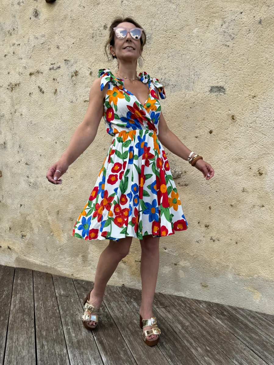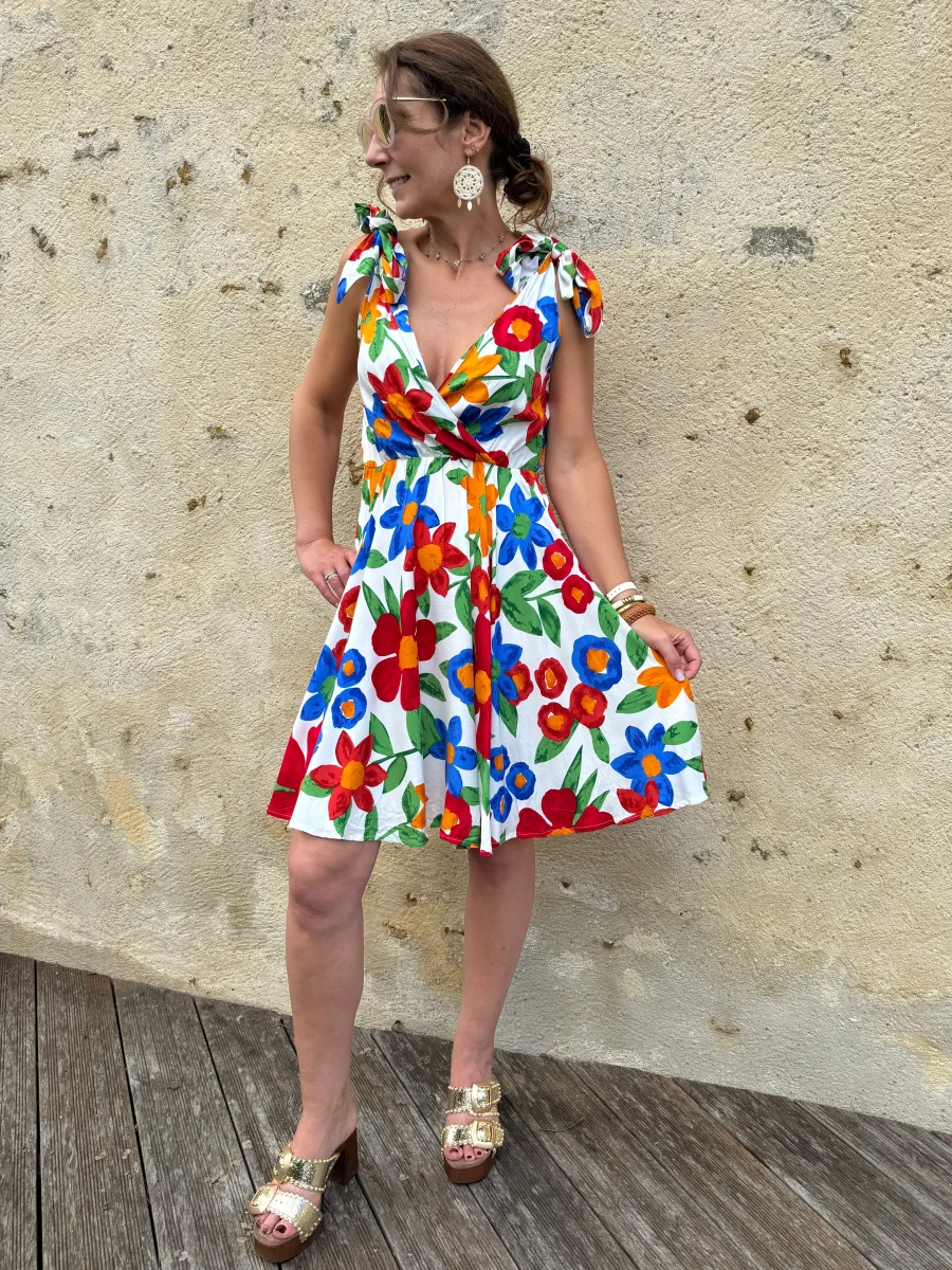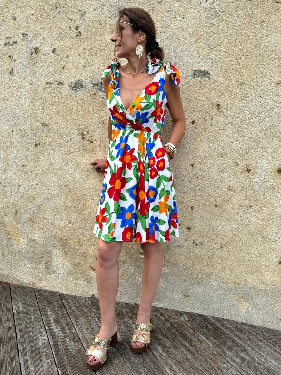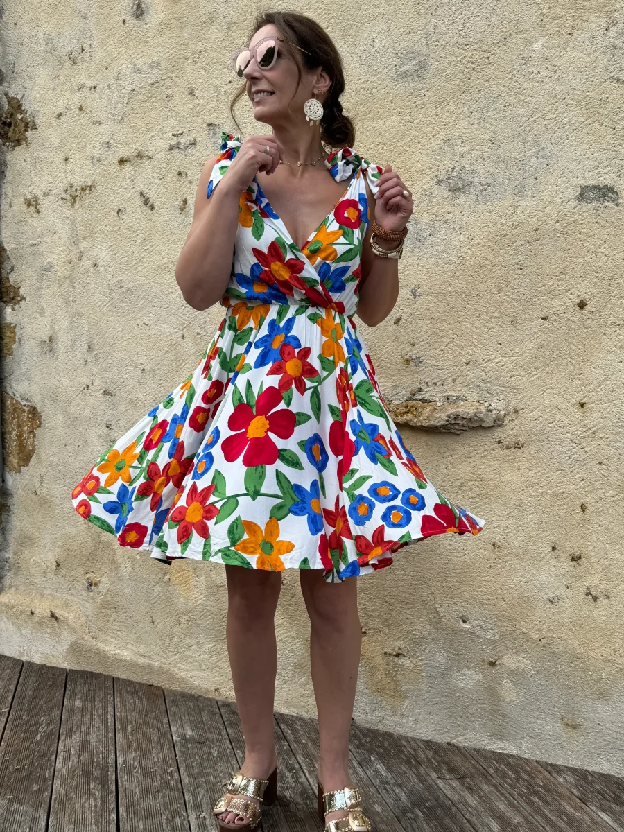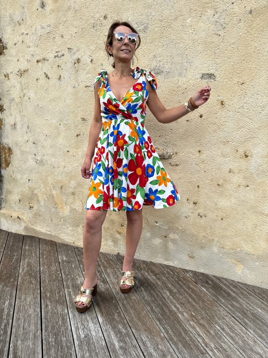 Retrouvez cette robe MARGAUX imprimé n°2 blanc avec ses fleurs multicolores signée Hippocampe dans votre boutique De La Mode la Rochelle.