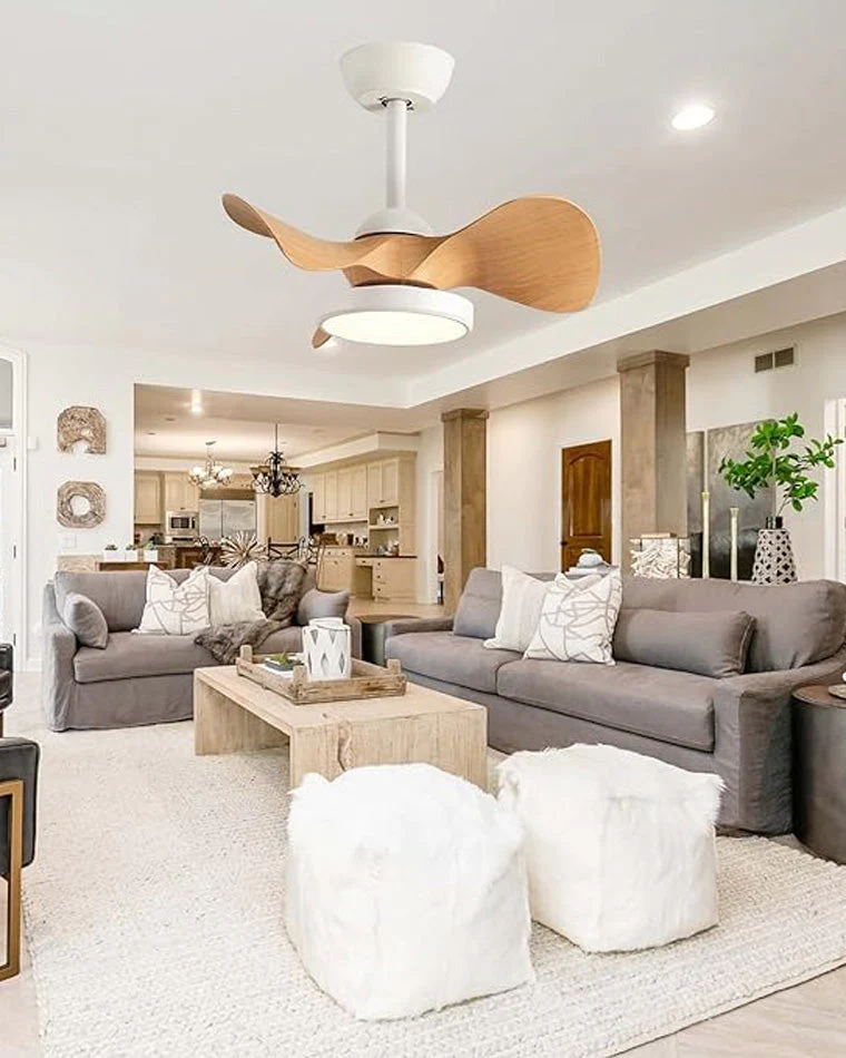 Esthétique minimaliste avec finition blanche et pales imitation bois