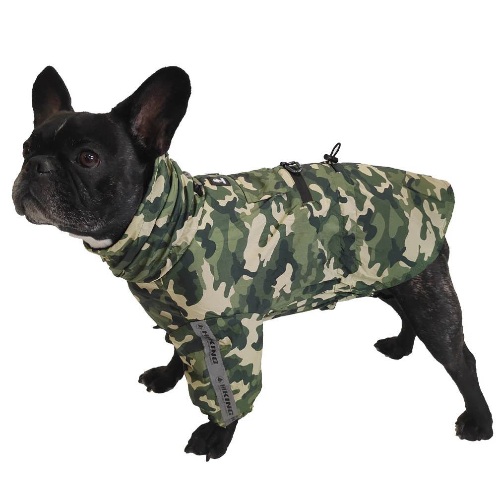 La veste imperméable de randonnée qui se replie sur elle-même et se transporte en sac de suspension, couvre l’intégralité du corps de votre chien : taille, cou et jambes.